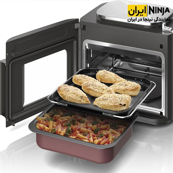 فر و مولتی کوکر رومیزی نینجا مدل SFP700 مجهز به فناوری combi cooker بوده که با داشتن المنت در بالا و پایین گردش حرارت داغ به شما امکان طبخ دو مدل غذای مختلف بصورت همزمان را می دهد و در طبقه پایین غذای کبابی آبدار و طبقه بالا غذای ترد و چیبسی را درست می کند. از پخت برنج گرفته تا پاستا، پیتزا، کیک، کاپ کیک، شیرینی، انواع کوکوها، مرغ شکم پر، ماهی و میگو سوخاری، جوجه، استیک گوشت، کباب کردن سبزیجات و گوشت، تنها موارد محدودی از عملکردهای کمبی نینجا sfp700 می باشد.