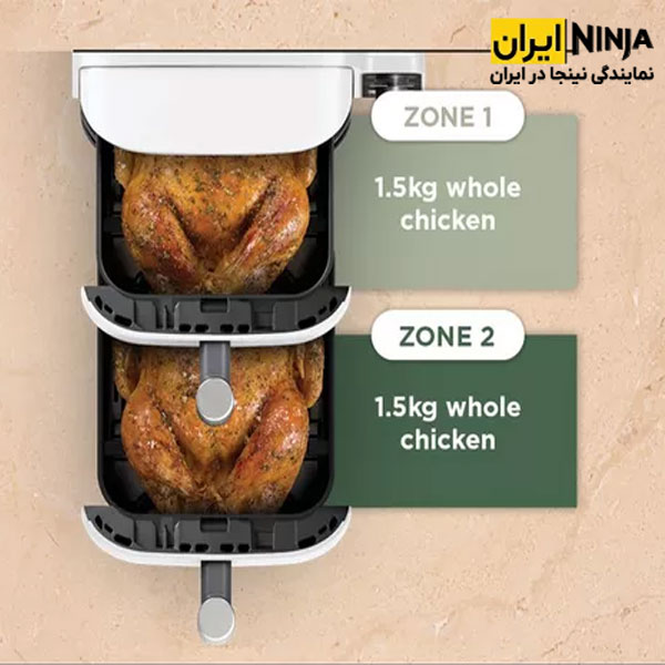 جالب است بدانید که این دستگاه سرخ کن با طراحی ویژه اش و تقسیم هر طبقه به 2 قسمت مجزا امکان پخت چهار غذای مختلف به طور همزمان را فراهم کرده است. شما می توانید هر محفظه را توسط سینی های توری به دو طبقه تبدیل کرده و 4 وعده غذایی را در یک زمان بپزید. ظرفیت کل سرخ کن 9.5 لیتر و حجم هر محفظه به تنهایی 4.75 لیتر می باشد و فضای کافی برای پختن یک مرغ سوخاری کامل 1.4 کیلوگرمی وجود دارد. بنابراین این مدل سرخ کن برای استفاده در مهمانی ها و خانواده های پرجمعیت بسیار کارآمد و مفید است.