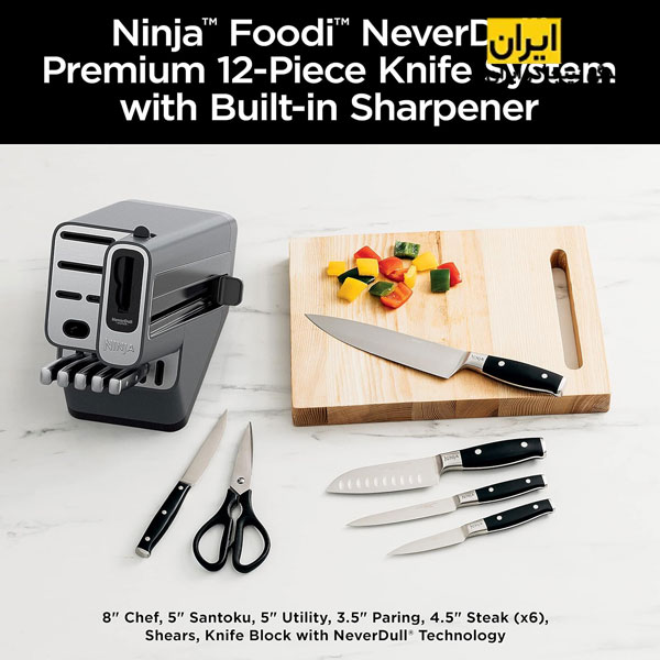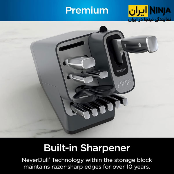 ست چاقو آشپزخانه نینجا مدل K32012 به چاقو تیزکن حرفه ای مجهز شده تا هر زمان در حین خرد کردن احساس کندی کردید، راحت و سریع چاقو را تیز کنید. با وجود این چاقو تیزکن همیشه چاقوها تیز و برنده هستند و در بالاترین سطح عملکرد خود قرار دارند. فناوری NeverDull به راحتی در محفظه نگهداری تعبیه شده است تا نتایج تیز کردن حرفه‌ ای را ارائه دهد که لبه تیز خود را برای بیش از 10 سال حفظ می‌ کند.