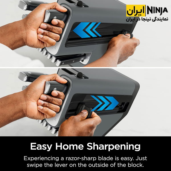 با وجود این قابلیت تیز کردن چاقوها در خانه بسیار راحت است. ابتدا چاقو را درون شکاف قرار داده و سپس دکمه کشویی را در قسمت بیرونی پایه بکشید. سنگ چاقو تیزکن، تیغه شما را در زاویه مناسب درگیر و فشار بهینه را اعمال می‌ کند تا لبه تیغه در عرض چند ثانیه به تیزی فوق‌ العاده برسد.